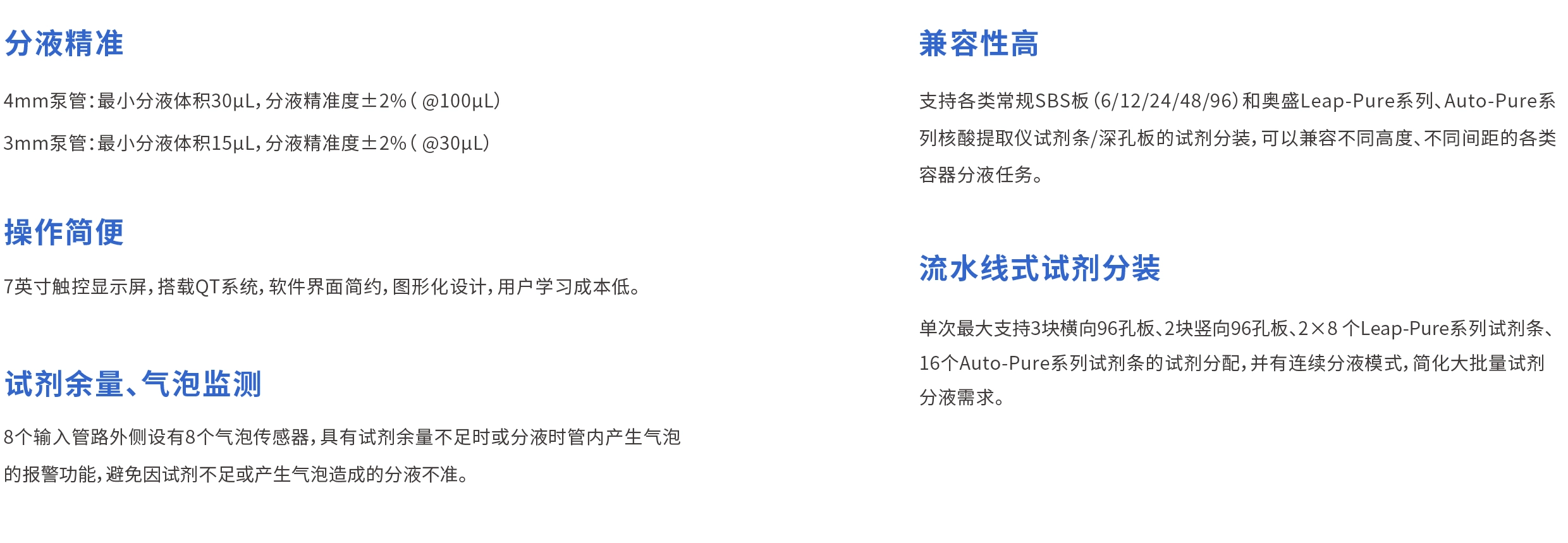 | 分液准确度 | 4mm硅胶管:±2%@100μL 3mm硅胶管:±2%@30μL |